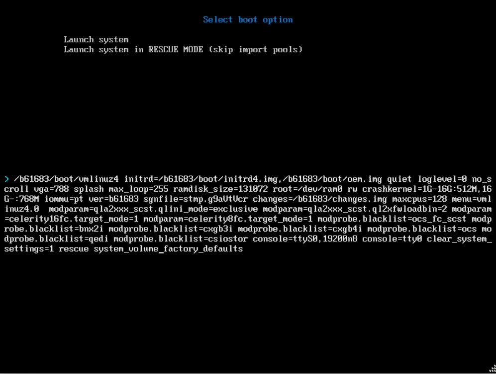 2. At the second boot screen, press TAB, then "end" on keyboard, then "space", and then - at the end of the command line add “clear_system_settings=1 rescue system_volume factory_defaults” and press ENTER.