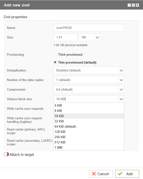 WARNING: remember to configure the Volume block size before starting the production. The changes affect only the data not yet written to the storage, meaning that data already stored will be unaffected. The default Volume block size (64 KiB) is a compromise between random and sequential I/O performance. To achieve better random I/O, a smaller Volume block size should be used. However, this comes with a tradeoff: as ZFS generates an ~300-byte checksum for every block regardless of the configured size, smaller Volume block size produces more checksums. This creates a bigger overhead for data which might affect the overall available storage size. Additional performance tuning tipsTo further tune the performance of your ZVOL-based storage you can refer to the following steps: